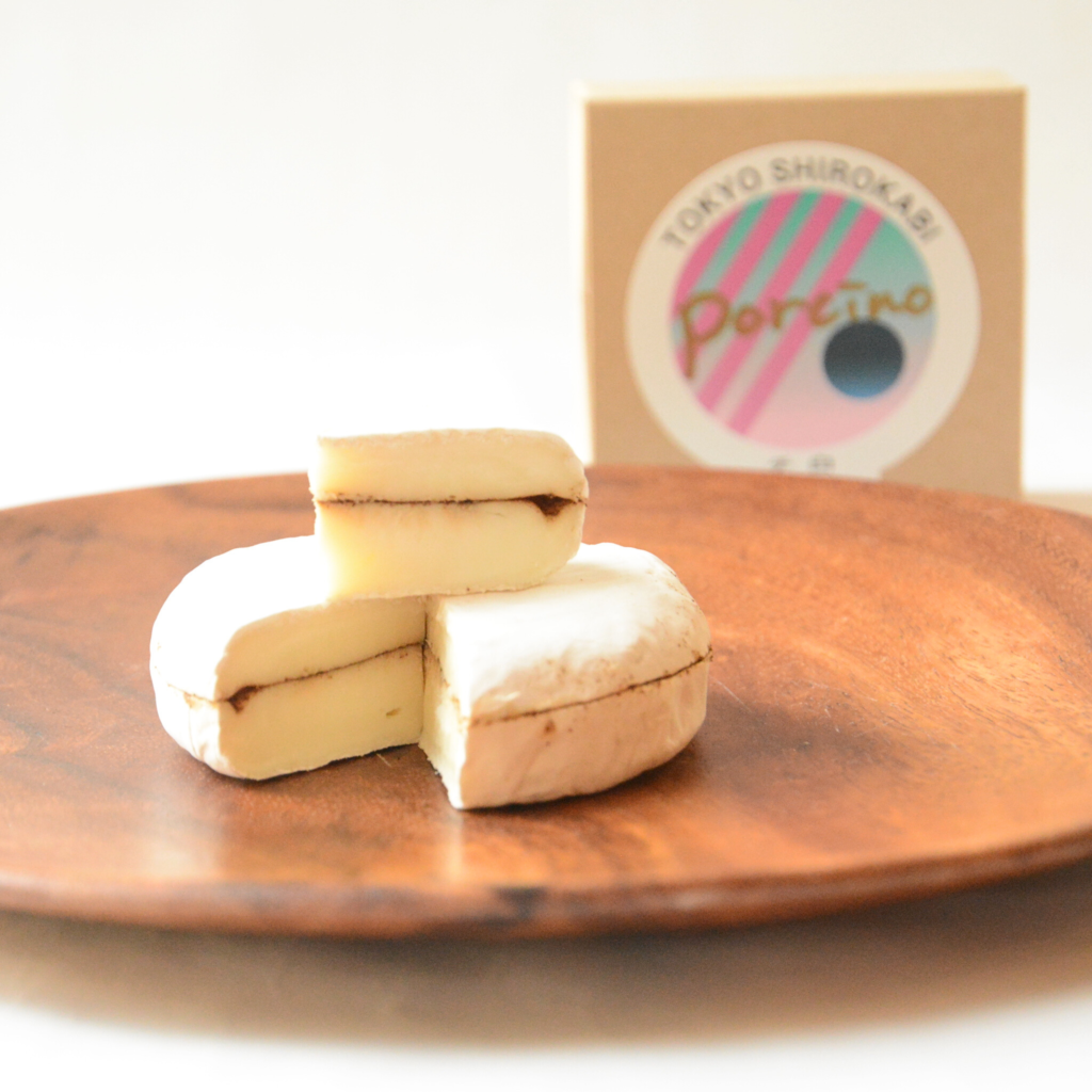 東京白カビチーズにトリュフとポルチーニをサンドして追熟をかけました。 もともと熟成が進むにつれ顕現する白カビ由来のマッシュルーム香にさらにトリュフとポルチーニの芳香が加わり混ざり合うことで、奥行きと広がりのある新しい白カビチーズの味わいが誕生しました。