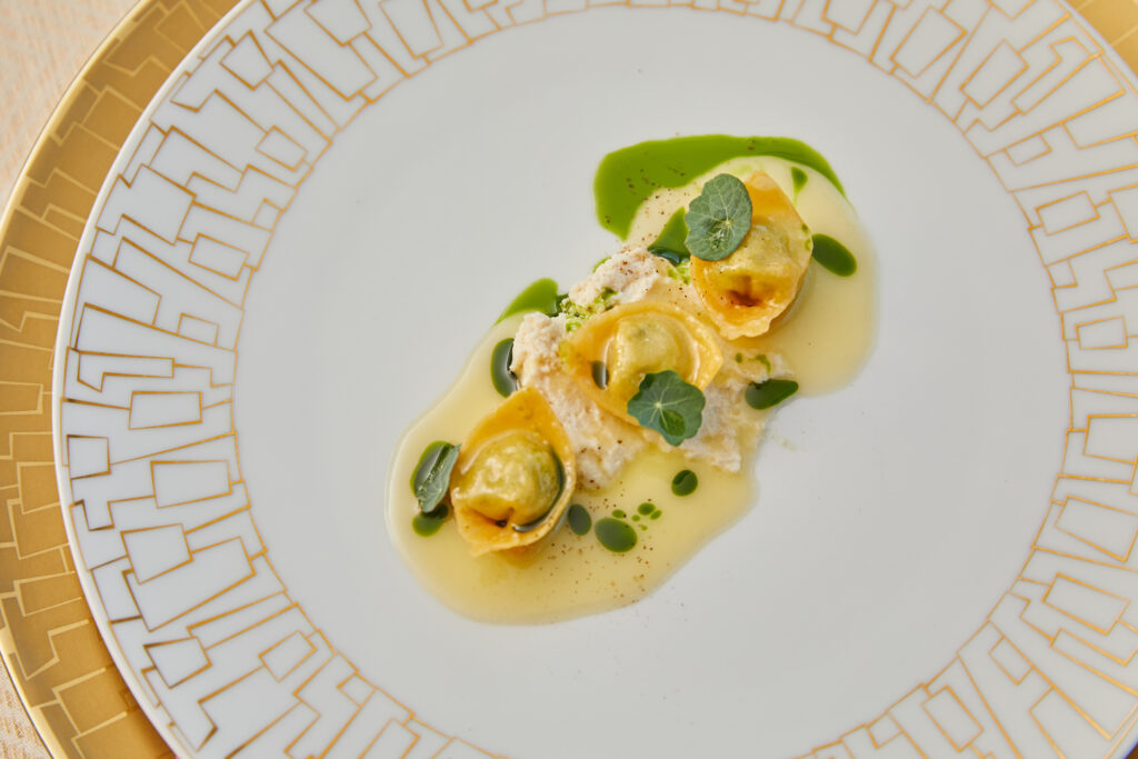 まず目を引くのは、鮮やかなクロロフィルのグリーンオイルが美しく映えるラビオリ。